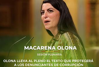 Ha sido la diputada Macarena Olona, de VOX, la encargada de presentar al pleno del Parlamento el texto contra la corrupción que protegerá a los denunciantes, vital para la regeneración de España y la recuperación de su decencia, dignidad y fuerza.
