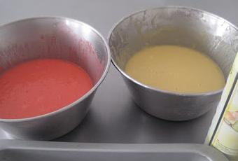 Preparación: Batir la mantequilla con el azúcar y el azúcar avainillado o esencia de vainilla. Cuando esté a punto de pomada ir añadiendo los huevos de uno en uno, de forma que hasta que no esté incorporado el primero no se agrega el segundo. Mezclar la harina con el impulsor y las almendras molidas y agregar a la prepración anterior. Separar en dos partes iguales esta preparación y una de ellas dejarla tal cual y a otra añadir el colorante. Una vez obtenidas las dos masa engrasar y enharinar un molde o bandeja grande y poner la mitad de la crema en un lado y la mitad en el otro, haciendo una separación con papel de aluminio, tal como se ve en la foto. También se pueden hornear por separado. Una vez hecho esto hornear a 180º C durante 45-55 minutos o hasta que al pinchar con una aguja , ésta salga limpia. Cuando este hecho el bizcocho desmoldar y dejar enfriar totalmente sobre rejilla. Cuando esté frío, cortar en cuatro partes y retirar toda la parte oscura. Formar el pastel o tarta como se ve en la foto, untando de mermelada en las uniones y luego todo el pastel.
