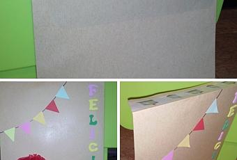 Un banderín por aquí, un lazo de encaje por abajo, unos sellos que quedan horrorosos en otro lado... Oh, no, así no, los sellos han quedado fatal, así que fuera sellos, y para taparlos un pompón encima, que además queda mas sofisticado. Un mensajito en vertical, aunque no es del todo de mi gusto y... tachán! Sobre acabado.