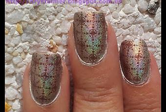 A mi me parece bastante moderno... ¿qué opináis? He estampado un dibujo de la placa Cheeky CH5 con esmalte marrón Kiko 373. Aunque no sea un esmalte especial para estampar creo que lo hace muy bien. Os enseño el esmalte holográfico que he utilizado como base: Es el 399. Espero que podáis ver bien el efecto... uso la cámara del móvil para echar las fotos... Bueno, espero que os haya gustado y que me dejéis vuestros comentarios. ¡Besos!