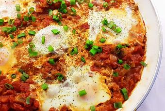 La Shakshuka es un plato originario del Medio Oriente que tiene como base tomates, especias y huevos. Es muy parecido a los clásicos Huevos Rancheros en México y al Menemen en Turquía. Esta vez le hemos agregado otro ingrediente adicional: Berenjena, que aporta además de sabor, vitaminas A, B1, B2, C y E y minerales como potasio, calcio, magnesio, hierro y fósforo.