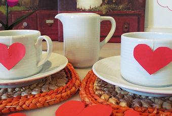 1. Recorta un par de corazones en cartulina. Nosotros hemos recortado algunos más para esparcir sobre la mesa o la bandeja de servir.2. Recorta un poco las etiquetas que traen las infusiones y pega con cola ambos corazones.