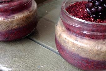 Batir las moras con unos 200 ml de zumo naranja. Agregar 2 cucharadas de chía y remover bien. Meter en los tarritos hasta un poco menos de la mitad y dejar reposar 10 minutos.