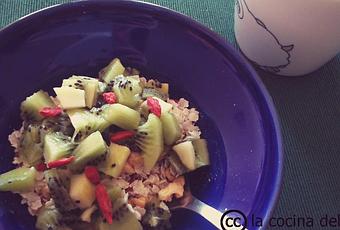 4 nueces1 cucharada de semillas de lino molidas1 kiwiBayas de goji al gustoUna taza de leche de almendrasUna cucharadita de cacao en polvoSirope de ágave para endulzarPREPARACIÓNEn un bol de desayuno ponemos los copos de arroz, las nueces, el lino, el kiwi picadito y las bayas de goji. Calentamos la leche, mezclamos con el cacao, endulzamos con sirope de ágave y lo añadimos a nuestro bol. Los copos de arroz están un poco más duritos que, por ejemplo, los de avena. A nosotros nos gustan así, pero si los quieres más blanditos,déjalos un rato remojados en la leche :-)