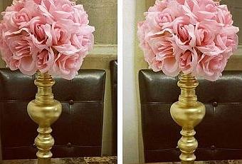 Primero tenemos esta idea que seguro no dejaras de usar, son unos hermosos floreros dorados en los cuales se ha colocado flores rosadas y sobre estas flores una hermosa corona también dorada, este es uno de los mejores adornos de mesa para 15 años modernos.