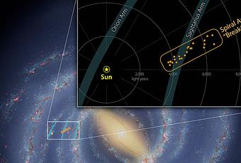 Se ha descubierto una característica no observada de nuestra galaxia, la Vía Láctea. Se trata de un contingente de estrellas jóvenes y nubes de gas formadoras de estrellas que sobresale de uno de los brazos espirales de la Vía Láctea. Con una extensión de unos 3.000 años luz, esta es la primera estructura importante identificada con una orientación tan diferente a la de un típico brazo espiral.