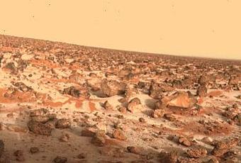 Imagen tomada por uno de los aterrizadores Viking en la que puede verse una capa blanca de escarcha cubriento el paisaje. Crédito: NASA/JPL