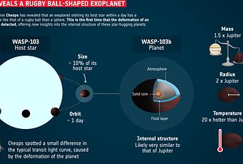 A este extraño y curioso exoplaneta se le conoce como WASP-103b y se encuentra en la constelación de Hércules. La forma tan extraña ha sido causada por las fuertes fuerzas de marea entre el exoplaneta y su estrella, llamada WASP-103, una estrella unas 1,7 veces más grande y un poco más caliente que el Sol. El estudio de este exoplaneta se ha realizado con el satélite de caracterización de Exoplanetas (CHEOPS) y con datos del telescopio Spitzer. La misión CHEOPS está dedicada a estudiar estrellas cercanas que se sabe que albergan exoplanetas, con el fin de realizar observaciones de alta precisión del tamaño del exoplaneta a medida que pasa frente a su estrella. Se centra en planetas en el rango de tamaño entre super Tierras a Neptuno. Con los datos que recoge se puede calcular la densidad aparente de los exoplanetas, una caracterización es un primer paso hacia la comprensión de estos mundos que orbitan otras estrellas.
