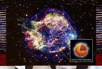 El recuadro muestra una impresión artística de la estrella de neutrones en el centro de Cas A. Las diferentes capas de color en la región de recorte muestran la corteza (naranja) y el centro (rojo), donde las densidades son mucho más altas, y la parte de la base donde se cree que los neutrones se encuentran en un estado superfluido (bola roja interior). Los rayos azules que emanan del centro de la estrella representan los números y abundantes neutrinos -partículas de débil interacción y casi sin masa- que se crean cuando la temperatura cae por debajo de un nivel crítico, dando lugar a la formación de un superfluido de neutrones, un proceso que comenzó alrededor de hace 100 años como se ha observado desde la Tierra. Estos neutrinos escapan de la estrella, arrastrando energía con ellos y provocando que la estrella se enfríe rápidamente.
