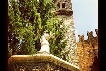 Y como ya sabéis que todo castillo tiene su propio fantasma, éste no podía ser menos. El Castello de Grazzano también tiene su propio fantasma pero mucho miedo no da y no es para nada hostil. Se cuenta que en el Castello existe un ser fantasmal que representa a una dama de nombre Aloisa. Esta dama era la esposa de un capitán de la milicia que fue traicionada por su marido y murió de dolor y celos. Desde entonces, su espíritu merodea por los bosques y la ciudad del castillo. Tiene incluso su propia estatua, se trata de una mujer rechoncha en piedra que esculpió el propio duque ya que se le apareció y le guió para que le hiciese un retrato. Con el tiempo, su figura se convirtió en la protectora de los enamorados y es por eso que las parejas van hasta su estatua para dejar alguna ofrenda (a veces chicles y esa manía de los italianos aún no he conseguido entenderla, en Verona los monumentos también tenían multitud de chicles pegados).
