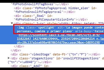 - Mira el atributo alt de la etiqueta de imagen <img> y encontrarás la descripción de la imagen según ha sido visualizada por Facebook.