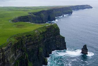 El sendero costero Moher es famoso entre los visitantes. Tiene 20 km de paisajes únicos y acantilados de hasta 214 metros. Ofrece vistas impresionantes del Atlántico.