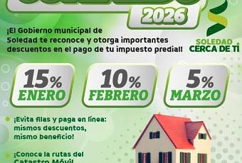 El Ayuntamiento de Soledad de Graciano Sánchez, a través de la Dirección de Catastro Municipal, implementará el programa Contribuyente Cumplido 2026, mediante el cual se otorgarán descuentos en el pago del impuesto predial durante los meses de enero, febrero y marzo de 2026, con el objetivo de facilitar el cumplimiento fiscal de las y los contribuyentes.
