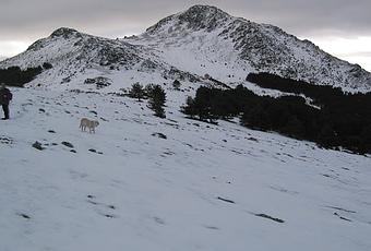 El Collado de la Tiesa extiende una inmensa sábana blanca amainada en su color por la nubosidad de la montaña, el sendero me encamina lentamente hasta el espolón abrupto que defiende la cima de Peñalacabra. Antes pasaré serenamente caminando por los pinares y las lomas intermedias. Aquí es el lugar donde quiero hacer la FOTOGRAFÍA para que se vea la llegada y la Cumbre, me acompaña Pipa quien fue conmigo muchos años y ahora sigue a mi lado en cada marcha desde el recuerdo y el corazón.