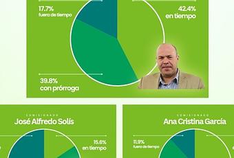 El desempeño de los comisionados ha variado significativamente. David Menchaca, el Comisionado presidente, resolvió en tiempo el 42.4% de sus casos y recurrió a prórrogas en el 39.8% de los casos. José Alfredo Solís, por su parte, ha mostrado un rendimiento particularmente pobre, resolviendo solo el 15.6% de las quejas en el tiempo estipulado, con un alarmante 29.8% de los casos resueltos fuera del plazo legal. Ana Cristina Garcia Nales ha demostrado ser la más eficiente, con el 63.4% de las quejas resueltas a tiempo.