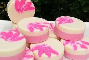 Hace poco descubrí unos moldes de plástico que realmente no son moldes sino partes de un biberón de esos que sirven para guardar las tomas de papillas de los bebés. El primer jabón que hice con ellos fue el anterior de las calabacitas y la verdad es que, aunque salen unos jabones no muy grandes, me tienen encantada por el resultado final y la cantidad de juego que dan.Tiempo atrás hice un jabón con incrustación de un rulo en forma de yin-yang. Me sobraron varios trozos y los guardé. Ahora he visto la posibilidad de usarlos en este diseño. Sólo tuve que cortarlos en láminas y como tienen forma de hojas, los puse en el fondo de cada molde en la forma en que se ven en las fotos y eché primero una capa de jabón con colorante rosa y otra capa de jabón con colorante blanco. Y bueno, aquí está el resultado, queda un jabón muy gracioso.