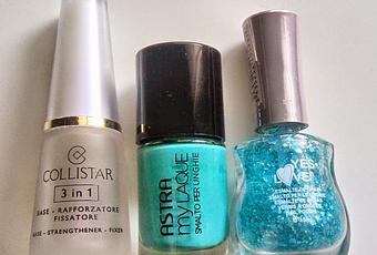 Otra manicura bastante sencilla como la anterior, la verdad es que estoy esperando a que me crezcan un poco más las uñas para poder hacer otras cosillas que tengo en mente. Como veis no he utilizado muchos esmaltes; de base un color turquesa de Astra, ¡¡adoro es marca!! (Aquí, podéis ver todos los esmaltes que tengo de esta marca) encima, he aplicado en todas las uñas dos capas de esmalte de Glitter. A continuación, en los dedos pulgar y anular he colocado estas pegatinas, que creedme tienen mucho tiempo y las vi y dije voy a empezar a gastarlas ya de una vez jeje. Para finalizar, Top Coat que no falte, para darle brillo y proteger las pegatinas para que tengan mas aguante.