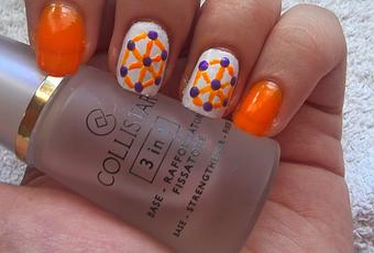 Todas las uñas van del mismo color exceptuando los dedos anular y corazón. Donde con ayuda de un punzón he marco una serie de puntitos de color morado como se ve en la imagen, después únicamente he unido esos puntos con el esmalte naranja también con el punzón pero con otro de punta más fina. Para finalizar una capa de Top Coat.