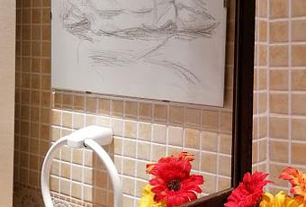 Un día encuentras en la red una foto que te resulta de lo más inspiradora, y la guardas con la idea de que pueda servir en un futuro para algún post... Eso nos ocurrió con la segunda imagen y sus pequeños dibujos a lápiz de dos desnudos femeninos. Sin buscarlos, fueron llegando por aquí y por allá otras damas y caballeros, algo desabrigados, posando para artistas deseosos de plasmar la belleza del cuerpo humano sin complejos ni impedimentos. Y todos esos bocetos y lienzos, ubicados en el baño. Lógico. Dónde mejor que estar como Dios nos trajo al mundo, que en esa estancia de nuestros hogares conocedora de todos nuestro más íntimo universo...En estos días en que hemos retomado el gusto olvidado por la pintura, se nos ocurrió rendirle un pequeño homenaje a la desnudez con un esbozo de una damisela tumbada de espaldas. Insinuando más que mostrando, añade un toque sensual a la decoración del baño que nos gusta mucho.
