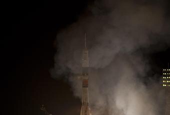 El cohete Soyuz TMA-01M despega desde el cosmódromo de Baikonur en Kazajistán a las 23:10 UTC del jueves 7 de octubre de 2010. La Expedición 25 está compuesta por el comandante Alexander Kaleri de Rusia, el ingeniero de vuelo de la NASA Scott J. Kelly y el ingeniero de vuelo ruso Oleg Skripochka, Tienen prevista su llegada a la Estación Espacial Internacional el sábado 9 de octubre. Foto.: NASA Image of the Day. Clic para ampliar.
