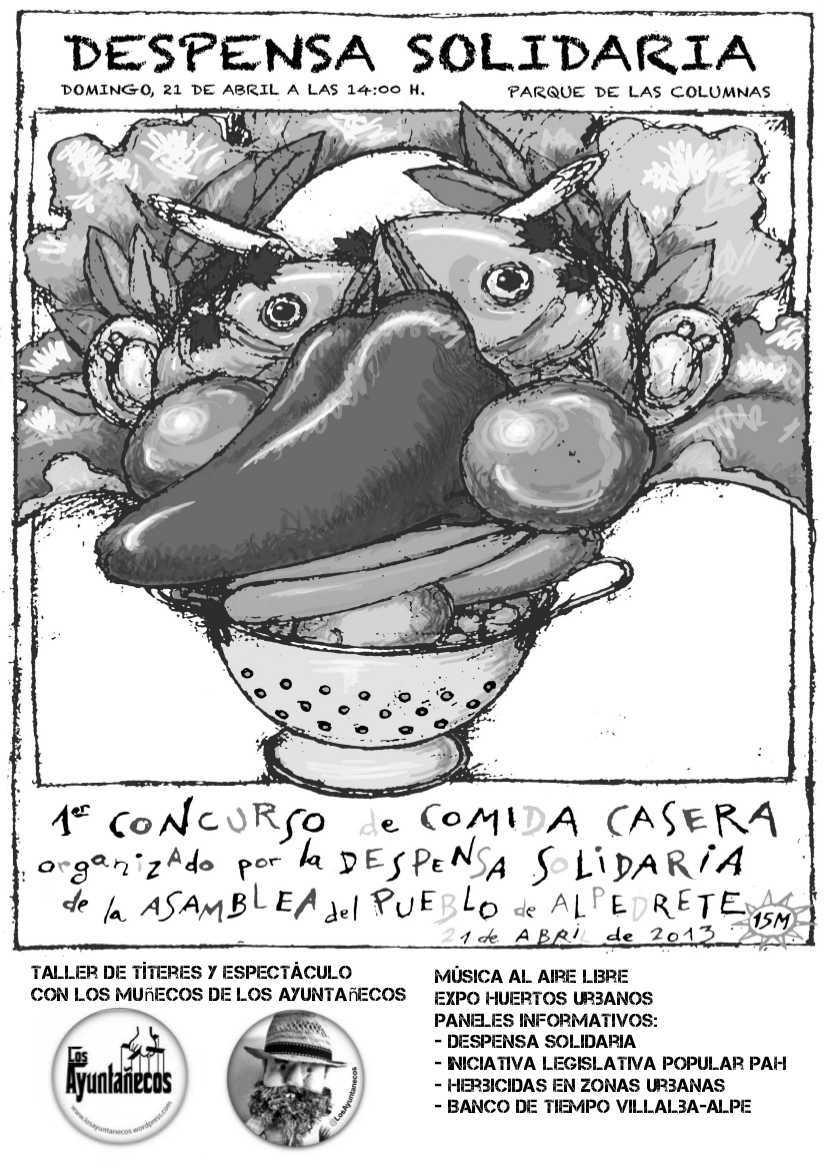 Vivimos en una situación de emergencia social dentro de una sociedad cada vez más injusta en la que las diferencias entre ricos y pobres se acentúan cada vez más.Pero podemos estar orgullosos, porque la participación ciudadana, organizada en asociaciones y movimientos como la PAH, el 15M, la mareas blanca, la verde, la UNI en la calle y otras están alcanzando, poco a poco, algunos logros. Hay que reconocer que las familias que pierden sus viviendas, ahora tienen una mejor perspectiva, pero la brecha entre ricos y pobres no hace más que en sancharse.Tenemos ya que abordar la cuestión de la pobreza y darle una respuesta. De momento y con máxima prioridad, con el apoyo mutuo.Por eso, la Asamblea 15M de Alpedrete, al igual que ya lo está haciendo Colla do Villalba y otros Municipios, propone la creación de una despensa solidaria para los que necesiten esta ayuda.Esta Asamblea se propone ir acopiando alimentos provenientes de donaciones para, un domingo de cada mes, proceder al reparto de lo que hayamos acumu lado, entre las familias que lo necesiten.La recogida de alimentos se haría los tres primeros domingos de mes en el Parque de Las Columnas, frente a la Plaza de Francisco Rabal, de 12 a 13, en la mesa de la Asamblea Popular de Alpedrete, y el reparto de lotes para afectados se haría el primer domingo de cada mes, en el mismo sitio.Aunque ahora vamos a repartir alimentos a unos pocos en situación precaria, estamos ayudándoos porque todos podemos necesitar esta ayuda mañana y necesitamos contar con todos.Los que hoy estamos en el paro; los que nos han quitado la vivienda, los que no tenemos Sanidad; todos los que lo estamos pasando mal, nos nece sitamos unos a otros y necesitamos hacernos fuertes. Entre todos podemos conseguirlo.No es para sentir vergüenza, es para sentirse indignados y así debemos manifestarlo. Lo que está ocurriendo no es porque hayamos hecho algo mal, sinó porque muchos otros no lo han hecho bien, y persisten en seguir por el mismo camino.Nuestro lema es:“JUNTOS PODEMOS. SI SE PUEDE”