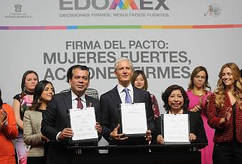 Toluca, Estado de México. En el marco del Día Internacional de la Mujer, el Gobernador Alfredo Del Mazo Maza indicó que la administración estatal trabaja para fortalecer la igualdad de género, combatir la discriminación y garantizar la protección y la defensa de los derechos de las mujeres mexiquenses.“En el Estado de México reconocemos que los retos persisten y que nuestro mayor desafío sigue siendo garantizar la protección y la defensa de los derechos de las mujeres.“Aprovechemos este momento, con decisiones firmes, eliminemos las ataduras que las detienen, y con resultados fuertes, respetemos su libertad para que impulsen sus capacidades, alcancen sus metas y consoliden su liderazgo. Este es el tiempo de las mujeres, hoy nada ni nadie detiene su causa”, afirmó.Acompañado por su esposa y Presidenta Honoraria del Sistema para el Desarrollo Integral de la Familia de la entidad (DIFEM), Fernanda Castillo de Del Mazo, el Gobernador del Estado de México firmó el Pacto: Mujeres Fuertes, Acciones Firmes, mediante el cual se promoverán leyes y políticas públicas con perspectiva de género, acciones para reducir brechas salariales y para la inclusión de mujeres en puestos de mandos medios y superiores.También se impulsarán permisos de maternidad; Centros de Cuidado Infantil para los hijos de funcionarios públicos; reforzar la paternidad compartida; utilizar un lenguaje incluyente y no sexista en las instituciones, promoción de la participación y el reconocimiento de las mujeres dentro de la vida política y en el sector privado.Informó que para asegurar el cumplimiento de estas acciones se crearán Unidades de Género, y para fortalecer el empoderamiento económico se desarrollarán proyectos sociales a través de empresas integradas por mujeres en situación de vulnerabilidad.Alfredo Del Mazo firmó también dos convenios, el primero de ellos con Nacional Financiera (Nafin), para que mujeres dueñas de micro, pequeñas y medianas empresas tengan mejores oportunidades de capacitación y financiamiento.El segundo fue el convenio de colaboración para Promover la Adopción del Protocolo de Actuación Frente a Casos de Violencia, Hostigamiento y Acoso Sexual en el Ámbito Laboral, con el Congreso del Trabajo y el Congreso Laboral del Estado de México, al cual calificó como un parteaguas en la contención y el combate de la violencia de género.El Gobernador mexiquense destacó que para alcanzar estos objetivos, es necesario que hombres y mujeres compartan la responsabilidad de construir una sociedad justa.“Estoy convencido de que mujeres y hombres compartimos la responsabilidad de construir una sociedad justa, en la que todas y todos tengamos condiciones de desarrollo igualitarias y las oportunidades para alcanzar nuestras metas y sueños”, expresó.Agregó que se requiere impulsar la sororidad, lo que implica que las mujeres emprendan acciones de manera colectiva y fortalezcan sus relaciones de hermandad, para promover el empoderamiento y el ejercicio de sus derechos humanos.Sostuvo que para el Gobierno del Estado de México, el principio de sororidad será el corazón de las políticas de igualdad y el eje para garantizar los derechos y las oportunidades de la mujer y sus familias.En el Salón del Pueblo de Palacio de Gobierno, el titular del Ejecutivo estatal manifestó que las mujeres son el pilar de los hogares y el corazón de la sociedad, por lo que su gobierno tiene el compromiso permanente de cuidar y proteger a este sector de la población, mediante el combate a la violencia de género, fortaleciendo sus derechos, la igualdad y la inclusión.“Sumando voluntades, con decisiones firmes y resultados fuertes, haremos de la sociedad mexiquense, una sociedad que con sus acciones fortalezca los derechos de la mujer, la igualdad y la inclusión, y que se comprometa en todo momento, a tratarlas con respeto y a reconocerlas con justicia”, puntualizó.Del Mazo Maza recordó algunas de las acciones que su administración ha realizado en favor de las mujeres mexiquenses, como la firma del convenio PROIGUALDAD con el gobierno federal, para combatir la violencia y la discriminación de género.Así como, la instalación del Sistema Estatal para la Igualdad de Trato y Oportunidades entre Mujeres y Hombres para Prevenir, Atender, Sancionar y Erradicar la Violencia contra las Mujeres, y poner en marcha el programa Salario Rosa que reconoce y empodera a amas de casa que viven en pobreza extrema.Cabe destacar algunos avances que ha tenido el sector femenil en los últimos años en el Estado de México, como ser una de las primeras diez entidades con mayor número de mujeres en el sector laboral, con 47.5 por ciento.También, siete de cada 10 egresados de los programas de capacitación para el empleo del gobierno estatal, son mujeres; en la actual Legislatura de la entidad, 37 por ciento son legisladoras, y el 17 por ciento de los municipios es gobernado por una mujer, cuando la media nacional es menor del 10 por ciento.Estuvieron en este evento, Natalia Calero Sánchez, especialista en Gestión de Programas de ONU Mujeres, Melissa Vargas Camacho, Vocal Ejecutiva del Consejo Estatal de la Mujer y Bienestar Social (CEMyBS), entre otras mujeres líderes en diferentes sectores de la entidad.