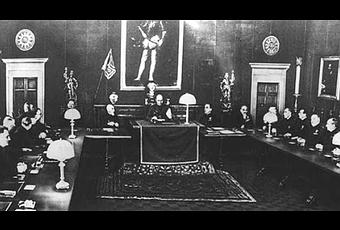Sesión del Gran Consejo Fascista en la que se aprobó la destitución de Mussolini (25.07.1943). Fuente de la imagen: https://www.infobae.com/america/historia-america/2018/07/25/a-75-anos-de-la-caida-de-mussolini-como-fue-la-dramatica-reunion-en-la-que-los-jerarcas-fascistas-traicionaron-al-duce/