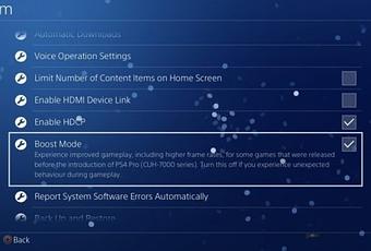 La segunda de las cualidades que añadirá el nuevo firmware será la llamada “Boost Mode” que añadirá una característica sólo compatible con PlayStation 4 Pro y que permitirá mejorar todos los títulos en su apartado gráfico sean o no compatibles con la versión Pro de PlayStation. Según el menú de PlayStation 4 este modo sirve para lo siguiente: