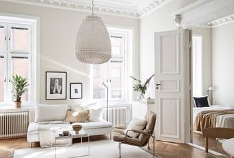 Los tonos blancos y arena enfatizan los refinados y elegantes detalles arquitectónicos de este pequeño piso sueco.