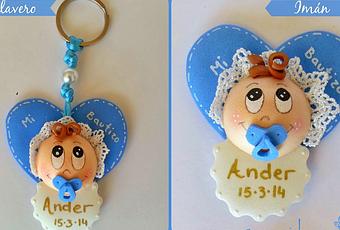 Fátima al verlos se puso en contacto conmigo ya que buscaba unos detalles de bautizo muy especiales. Le había gustado la carita de bebé que yo había ideado inicialmente como broche, pero prefería que fuera en forma de imán y llavero, por lo que me puse manos a la obra para crear el diseño final y esté fue el resultado: