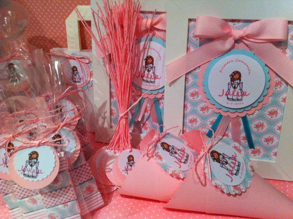 Os mostramos estos detalles de que hemos hecho, decorados con el estampado mint rosaY para la etiqueta, la niña de comunion con lazo rosa Tenemos etiquetas sueltas para decorar regalos, conos para golosinas, paquetitos de chocolatinasY estas laminas decoradas y personalizadas