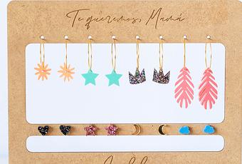 Lo que más me ha gustado de esta colección del Día de la Madre es su pack de pendientes a elegir entre varios preciosos + soporte para que mamá ponga sus pendientes habituales, este soporte lleva la frase "Te queremos, Mamá" o "Te quiero, Mamá" y debajo se puede personalizar con el nombre de la madre o el del hijo o hijos, ¡es una idea fantástica para que mamá lo tenga en su tocador con todos sus pendientes organizados! 🙂