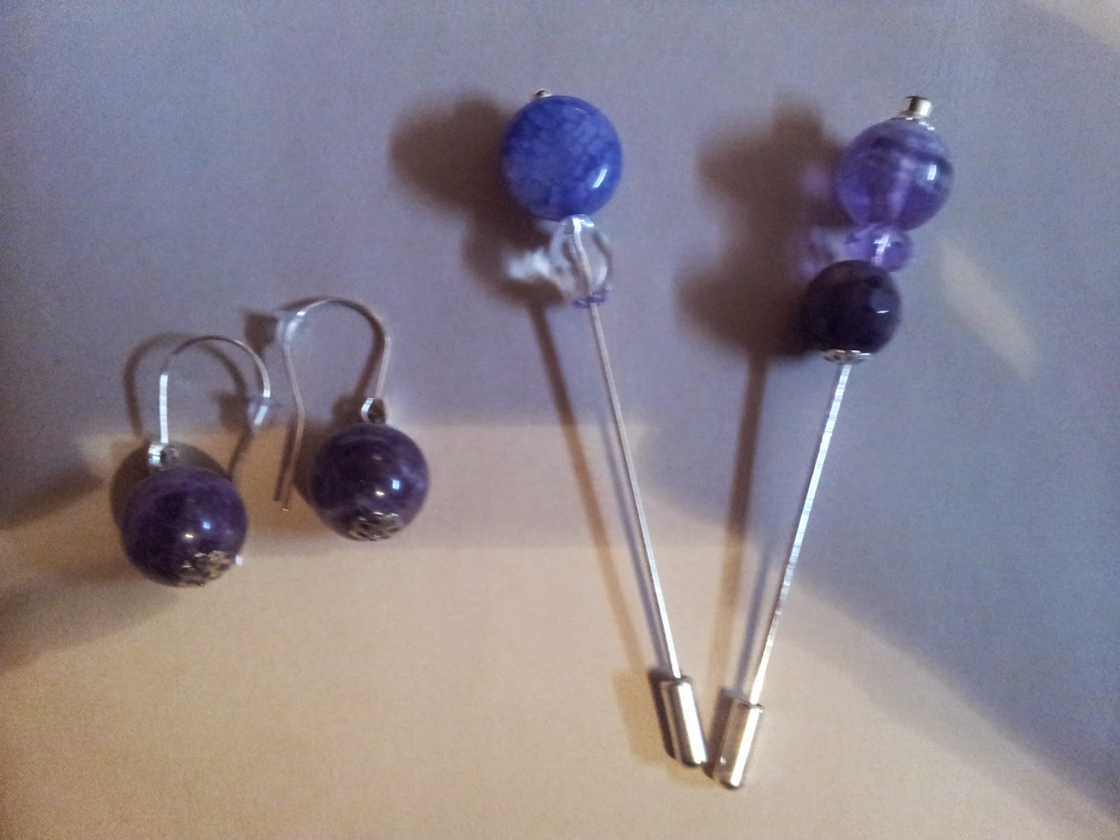 Conjuntos de ágatas azules, alfileres de distintas maneras, pulsera y pendientes con enganche de plata.