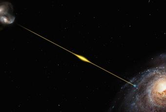 This artist’s impression (not to scale) illustrates the path of the fast radio burst FRB 20220610A, from the distant galaxy where it originated all the way to Earth, in one of the Milky Way’s spiral arms. The source galaxy of FRB 20220610A, pinned down thanks to ESO’s Very Large Telescope (VLT), appears to be located within a small group of interacting galaxies. It’s so far away its light took eight billion years to reach us, making FRB 20220610A the most distant fast radio burst found to date.
