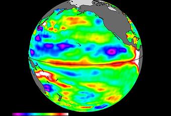 Los datos más recientes del nivel del mar del satélite estadounidense-europeo Sentinel-6 Michael Freilich indican signos tempranos de un desarrollo de El Niño a través del Océano Pacífico ecuatorial. Los datos muestran que las olas Kelvin, que tienen aproximadamente de 2 a 4 pulgadas (5 a 10 centímetros) de altura en la superficie del océano y cientos de millas de ancho, se mueven de oeste a este a lo largo del ecuador hacia la costa oeste de América del Sur.