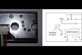 El sensor GP2Y10 de Sharp es especialmente efectivo detectando partículas muy finas de polvo en el aire, de hasta 0.5 micras, y se utiliza frecuentemente para detectar la calidad del aire en sistemas de purificación del aire o en sistemas de aire acondicionado. Este sensor de detección óptica está compuesto internamente por un diodo emisor de infrarrojos (IRED) y por un fototransistor, colocados diagonalmente de tal forma que son capaces de detectar las reflexiones de luz sobre las partículas de polvo en el aire.Especialmente es eficaz para detectar partículas muy finas como las del humo de un cigarrillo, pudiéndose distinguir el humo del polvo de la casa mediante un patrón de impulsos basado en comprobar el voltaje de la salida (Vo) cada 10ms, averiguando cuantas veces se interrumpe la comunicación entre el IRED y el fototransistor, y por lo tanto conociendo la densidad y la concentración de partículas de polvo o humo que hay en un determinado instante.
