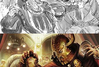 Es una ilustración que sale, si no estoy equivocado, en la aventura clásica re-adaptada para esta edición del juego y que viene en el suplemento, A Night at The Opera, obra de Graeme Davis. En esta imagen Detlef Sierck, el gran dramaturgo, descubre que el actor que hace del villano Constant Drachenfels, no es un actor, el legendario nigromante vuelto de entre los muertos y que quiere acabar con todos!.
