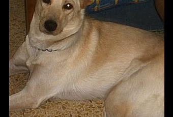 Perrita adulta color canela, casi blanca, tiene cruce de pastor alemán con labrador. De tamaño grande.7 años