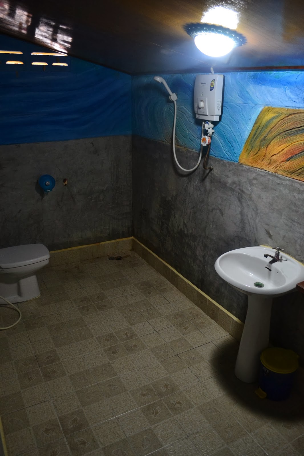 La habitación que nos asignaron tenia vista al precioso jardin y parcialmente a la playita, un frigobar y aire acondicionado, y el baño fue toda una novedad por su diseño minimalista, aun cuando una preciosa pintura de apsaras acompañaba nuestras duchas sin cortina.