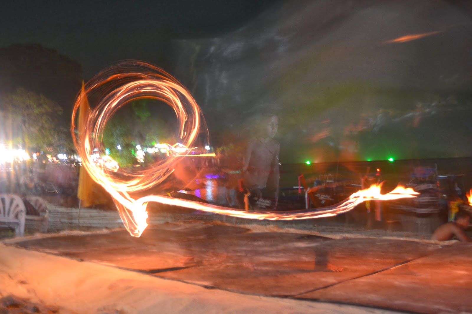 Caminamos bastante por el paseo que corre contiguo a al mar y elegimos esa noche comer en el restaurante Kuhn Va, cerca del cual también ubicamos una agencia de viajes con la que pactamos el recorrido de las 7 islas el día siguiente, nos ubicamos en una mesita exterior y desde ahí nos dedicamos a ver el mundo pasar y a degustar uno de los mejores Pad Thai del viaje. Y desde ahí animadas por la música en vivo, y por las recomendaciones universales (porque absolutamente todo el mundo nos recomendó pasar al menos una velada allí) , caminamos hacia Carlito´s Bar (www.carlitosbar.net) .Apenas entramos llego una rubia y nos ubicó un estupendo asiento en la arena, ofreciendo cerveza y mojitos (un poco aguado, pero muy bonito), contándonos que el espectáculo de fuego estaba por comenzar.