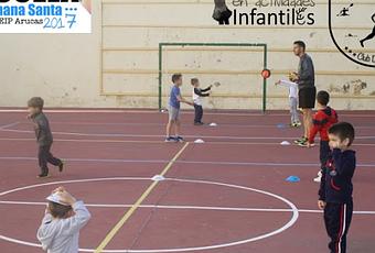Imagen. Niños/as del grupo A disfrutando del mini-baloncesto. Dicho esto, el segundo día de la Escuela de Semana estuvo dedicada al deporte, donde el grupo "A" y "B" disfrutaron de diferentes modalidades.