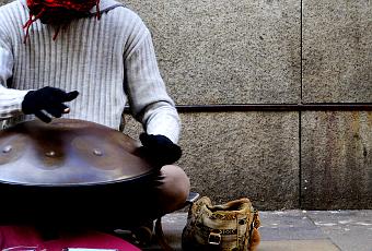 Al fin fuera del metro. Aire… y música. Un sonido harmónico envuelve a las decenas de personas que bullen a mi alrededor. ¿Qué es ese instrumento? Me siento en un banco justo enfrente del joven; entre sus piernas tiene algo parecido a un wok y usa sus manos para hacerlo sonar.