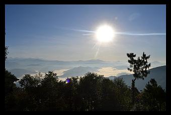 Llegamos al Hotel View Point desde cuya terraza pude disfrutar de un fresco amanecer observando como el sol salía sobre las más altas cumbres del planeta, indicadas en cada uno de los vértices del mirador y, además un poco más abajo, entre las verdes laderas del valle, como se colaban las nubes entre medio de las colinas ... un espectáculo conmovedor.