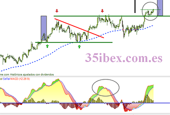 Dentro de las elucubraciones futuras para Día, podemos “esperar” que una vez rota la resistencia, hecho su consabido pull y demás gaitas, el objetivo es cumplir la subida de la altura que marca el rectángulo, o sea que Día puede llegar a cotizar en el entorno de los 7 euros, cifra por supuesto que cuando empezó a cotizar allá por julio del 2011 se me antojaba excesiva…¿Dónde tendré yo la bola de cristal?