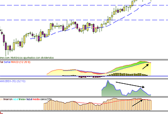 Los gráficos diarios de Día (valga la redundancia) nos muestran un cierto agotamiento en el MACD, con una línea de tendencia cortada a la baja un poco antes que el precio, una señal temprana de salida. La mano fuerte está fuera, aunque la vela de hoy ha sido con gran volumen, realizando la cotizada un pull a su línea de tendencia rota.