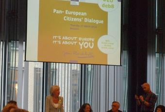 Diálogo Ciudadano PanEuropeoDurante el diálogo hubo una presentación de un Informe sobre los 50 ya realizados y nos dividimos en grupos de discusión para tratar diversos temas: solidaridad, derechos del ciudadano, competitividad, cambio climático, protección del consumidor y empleo y educación. La organización estaba hecha de tal forma para que cada uno de nosotros participase en dos de estos grupos, en cada grupo nos dividíamos en subgrupos. En cada subgrupo proponíamos una serie de ideas y luego estas eran votadas por todos los participantes del grupo. El autor de este blog participó en derechos del ciudadano y en empleo y educación. En derechos de los ciudadanos salieron propuestas para fortalecer de los derechos de los ciudadanos y mejorar la información al respecto y en Empleo y Educación, propuestas para mejorar la educación y la posibilidad de encontrar trabajo.