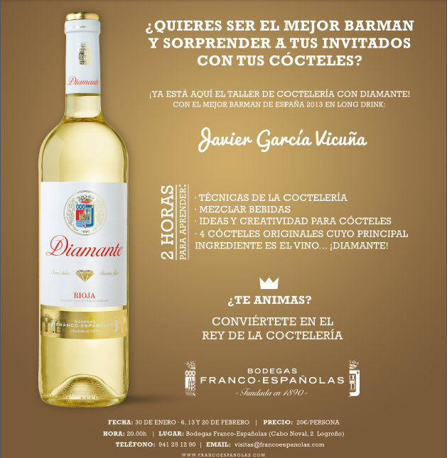 Taller de coctelería Diamante.Fechas: 30 enero, 6 febrero, 13 febrero y 20 eneroHora: 20:00 hrs.Precio por persona: 20 e.Lugar: Bodegas Franco-Españolas (Cabo Noval, 2 - Logroño)