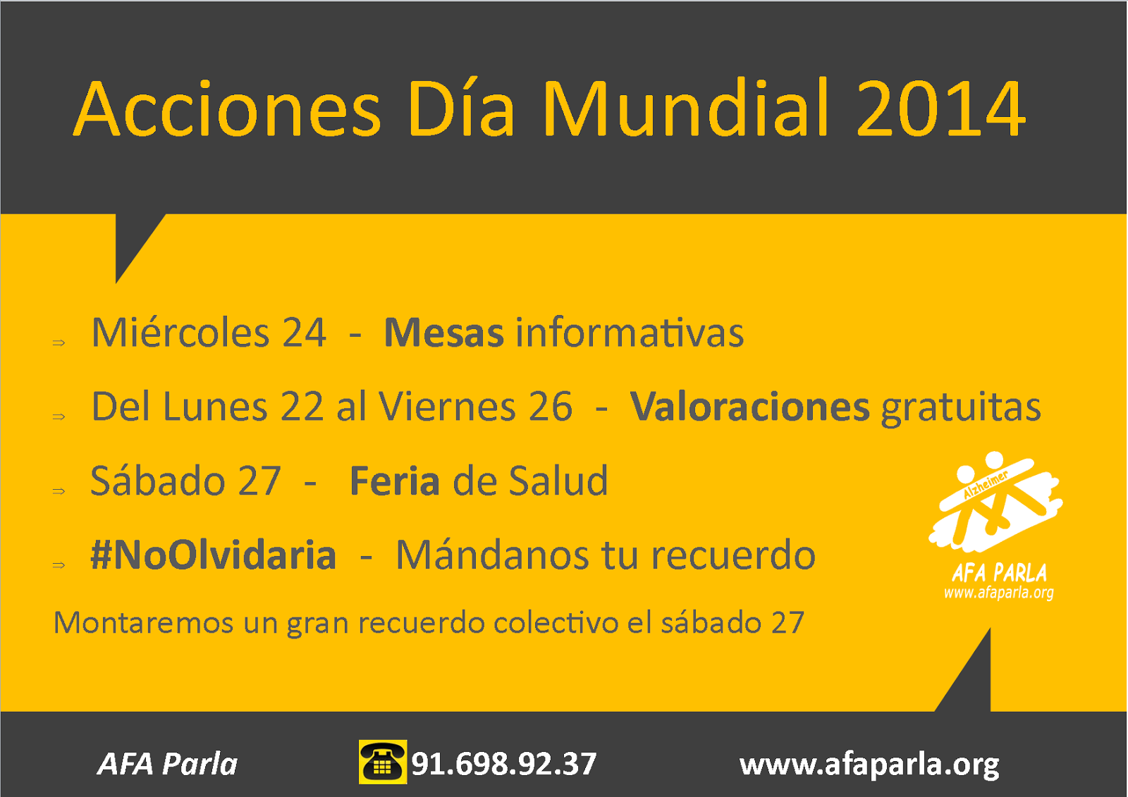 En AFA Parla llevamos desde el mes de Mayo sensibilizando a la población a través de nuestra campaña #NoOlvidaría en la que hemos recogido numerosos recuerdos que l@s internautas no quieren olvidar y con los que construiremos un panel en la Feria de la Salud el próximo sábado día 27.