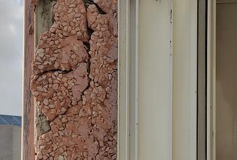 Un ejemplo de material de fachada de los años 60como esta grava chafada sobre el mortero fresco ha sufrido las inclemencias del tiempo (metereológico y el temporal). El trabajo de los técnicos pasa por informar de los problemas de este tipo, en proponer una solución técnica y en presentar el proyecto o memoria técnica para obtener la licencia correspondiente, ocupación de la vía pública y la dirección de obra y la coordinación de seguridad.