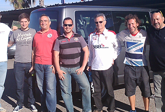José Ángel, Manuel, José Luis, Doron, Joaquín, Fernando y Carlos ocupaban el vehículo, en el que se turnaban cuatro conductores haciendo en torno a 350/500 Kms por barba diarios, con los descansos correspondientes. Terminamos comiendo en Valencia con la mente de dedicarle un homenaje a la vuelta si toda salía bien. Les podemos asegurar que no faltaron viandas de ningún tipo con sus bebidas correspondientes.